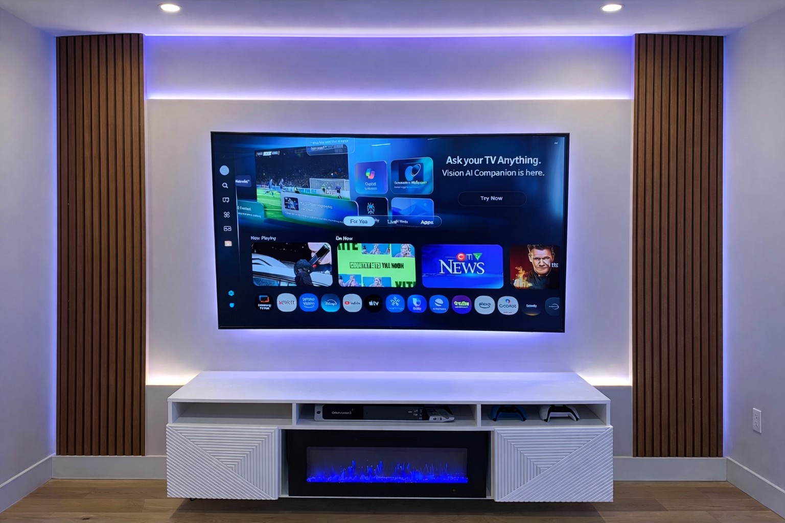 Designed and installed a modern feature media wall with concealed wiring, integrated LED accent lighting, and precision-mounted display. Completed with clean symmetry and seamless integration into the existing interior — delivered at a reduced promotional rate without compromising quality.