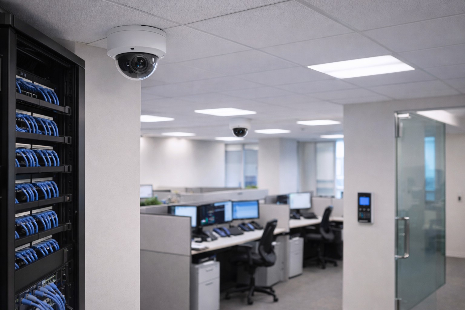 Installed interior dome surveillance cameras within commercial office environment. System integrated into structured network infrastructure for centralized monitoring and secure access control.