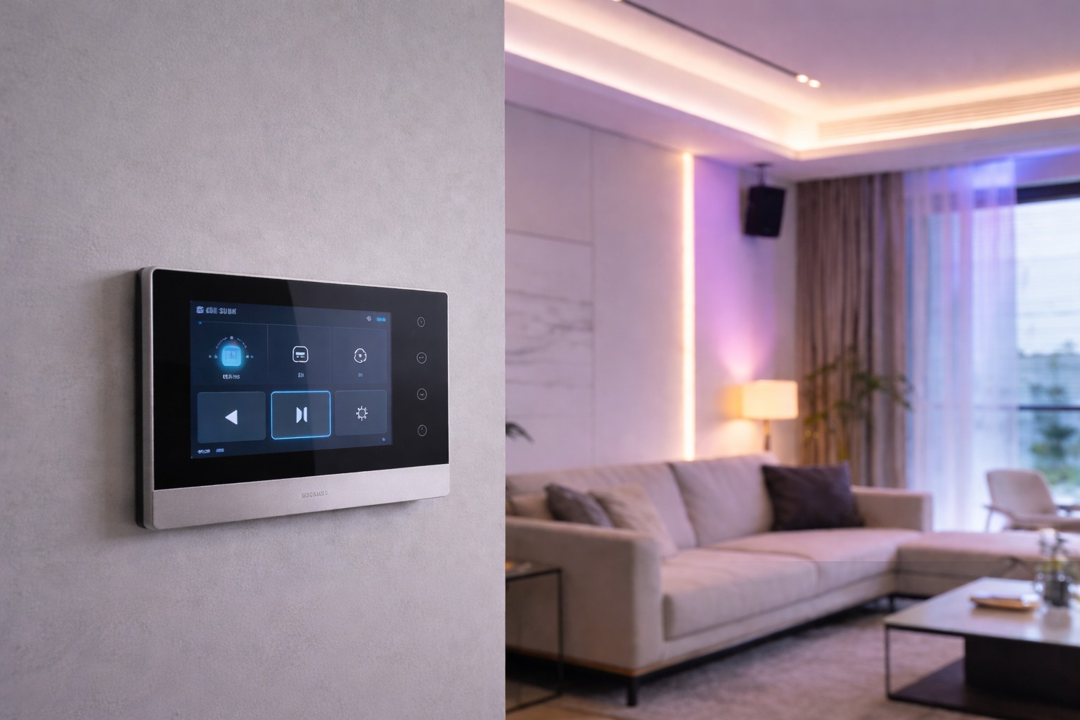 Integrated lighting automation, surveillance, and centralized control systems within a modern residential environment. Deployment focused on seamless operation, user-friendly control, and clean architectural integration.