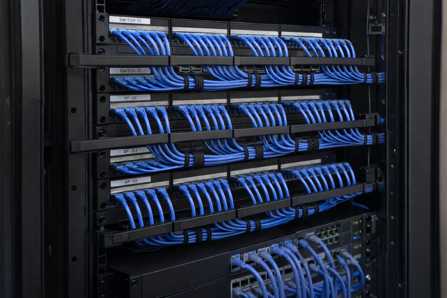 Installed and organized structured cabling system with labeled patch panels and optimized cable management. Designed for scalability, maintenance efficiency, and reliable network performance.